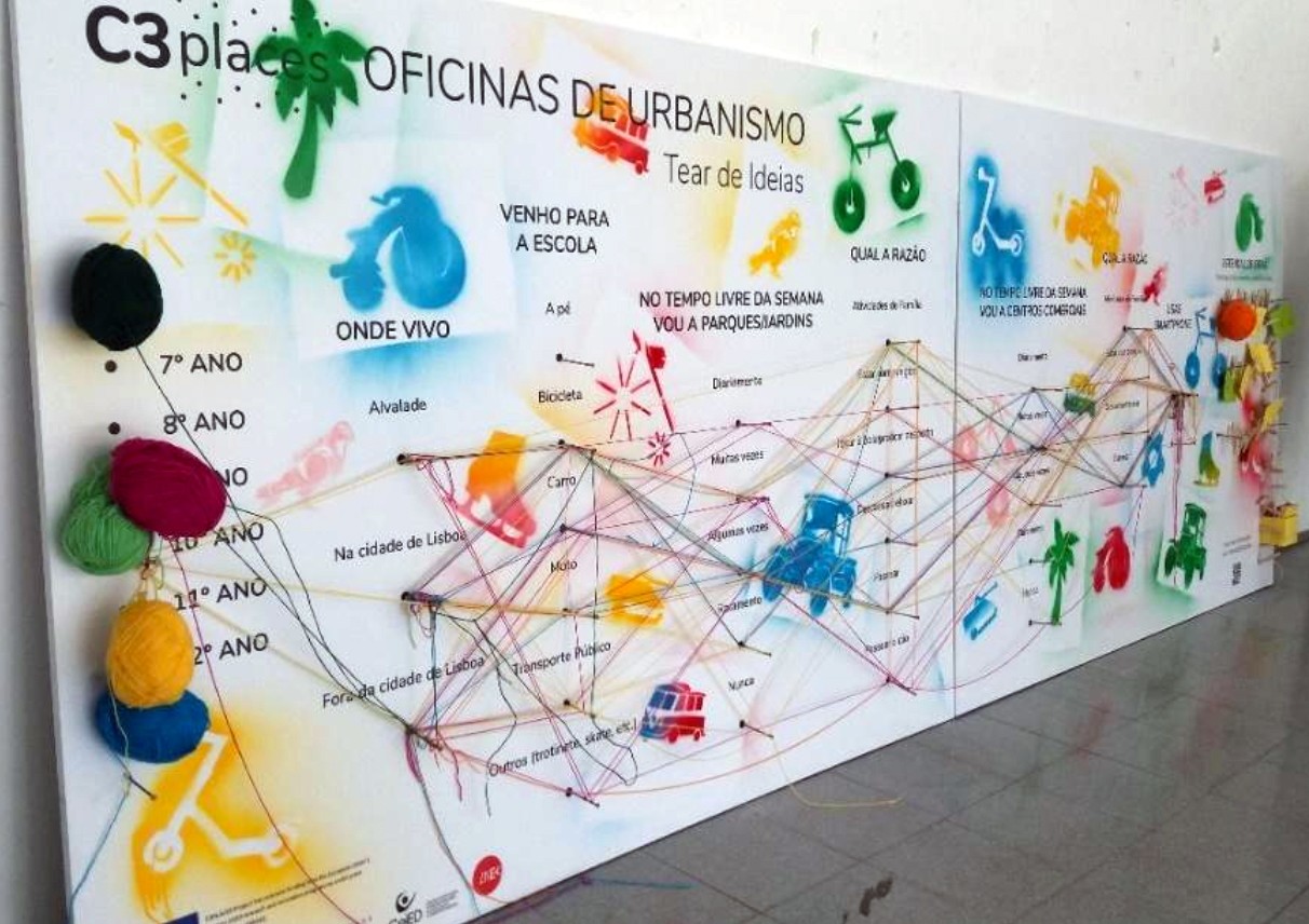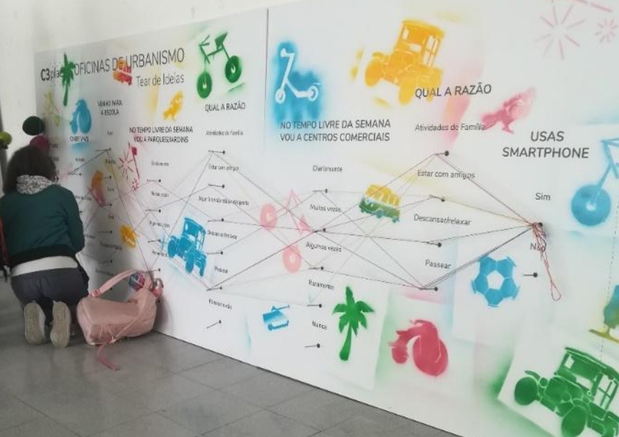 As part of the case study in Lisbon, the C3Places Project organised in the period of May 27th to 30th, 2019 four sessions of public space design in the Secondary School Padre Antonio Vieira, in Alvalade. In order to boost awareness and to call the attention of all students to the workshop sessions, the Project team posed some questions about students’ spatial practices in a fun and informal way. A board called Tear de Ideas (Portuguese for loom of ideas) was placed in the school atrium containing seven multiple choice questions displayed in columns. For each school grade different coloured woollen yarn hang next to the questions; to answer the questions the students wrapped the yarn around the corresponding nail.
