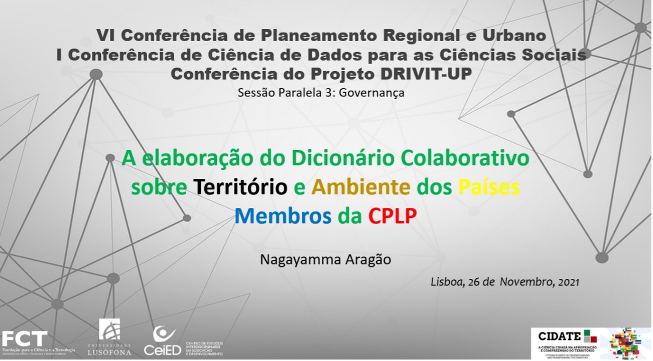On the past 26 November, CIDATE researchers Nagayamma Aragão, Carlos Smaniotto Costa and Zuinder Manico, presented at the Conference on Regional and Urban Planning organized by the University of Aveiro, the communication entitled The elaboration of the Collaborative Dictionary on Territory and Environment of the CPLP Member Countries in the “parallel session 3. Governance”. In this paper, elaborated in the scope of the project Dicionário Ilustrado do Território e Ambiente | DITA (Illustrated Dictionary of Territory and Environment), the theoretical framework and the modulation of the platform architecture were presented, following the work developed in L3EP, focused on territory, environment, co-creation, citizen science.