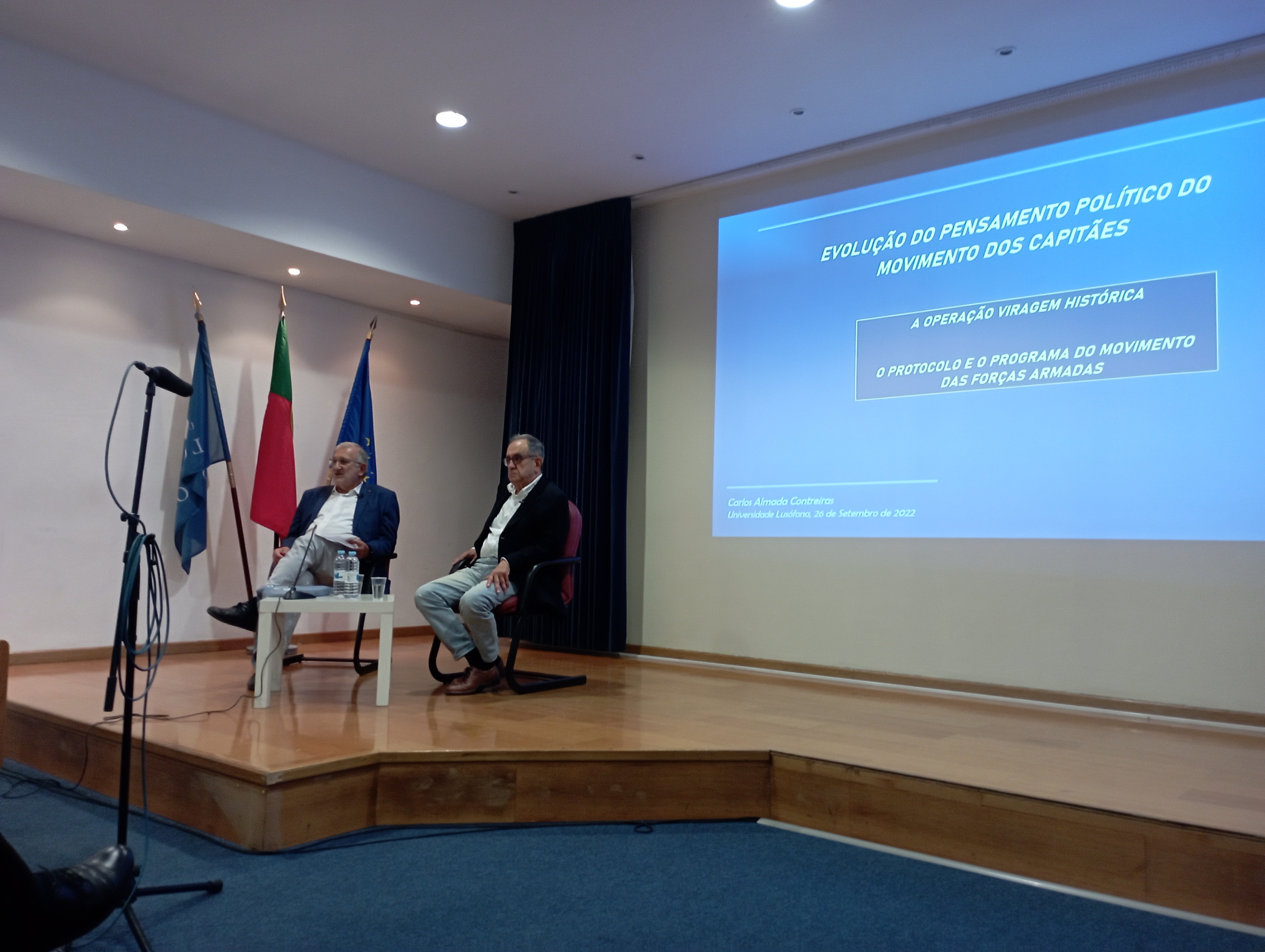 The Conversation was presented and moderated by António Teodoro and was attended by Dr. Maria Inácia Rezola, Executive Commissioner of the Mission Structure for the Commemorations of the fiftieth anniversary of the Revolution of April 25, 1974. Commander Carlos Almada Contreiras presented a paper entitled: “Evolution of Political Thought of the Captains’ Movement – The Historic Turnaround Operation. Protocol and the Armed Forces Movement”. The presentation contextualized the background and the War in Africa in the summer of 1973, the phases of the evolution of the political thought of the Captains’ Movement, the plan of operations on “D” day (April 25, 1974) and the documents of the revolution, the changes to the program introduced in Pontinha and the constitutional laws. The initiative ended with a short question and answer session.