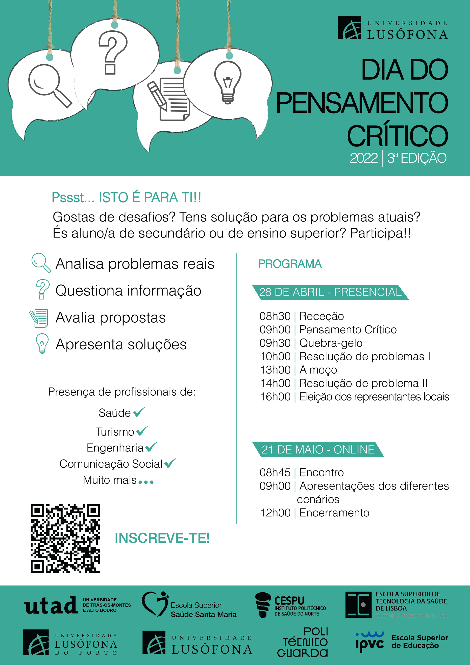 This event will take place on April 28th 2022 and expects to count with the presence of 100 participants from ULHT, being open to all students from all areas and study cycles.