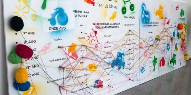 As part of the case study in Lisbon, the C3Places Project organised in the period of May 27th to 30th, 2019 four sessions of public space design in the Secondary School Padre Antonio Vieira, in Alvalade. In order to boost awareness and to call the attention of all students to the workshop sessions, the Project team posed some questions about students’ spatial practices in a fun and informal way. A board called Tear de Ideas (Portuguese for loom of ideas) was placed in the school atrium containing seven multiple choice questions displayed in columns. For each school grade different coloured woollen yarn hang next to the questions; to answer the questions the students wrapped the yarn around the corresponding nail.
