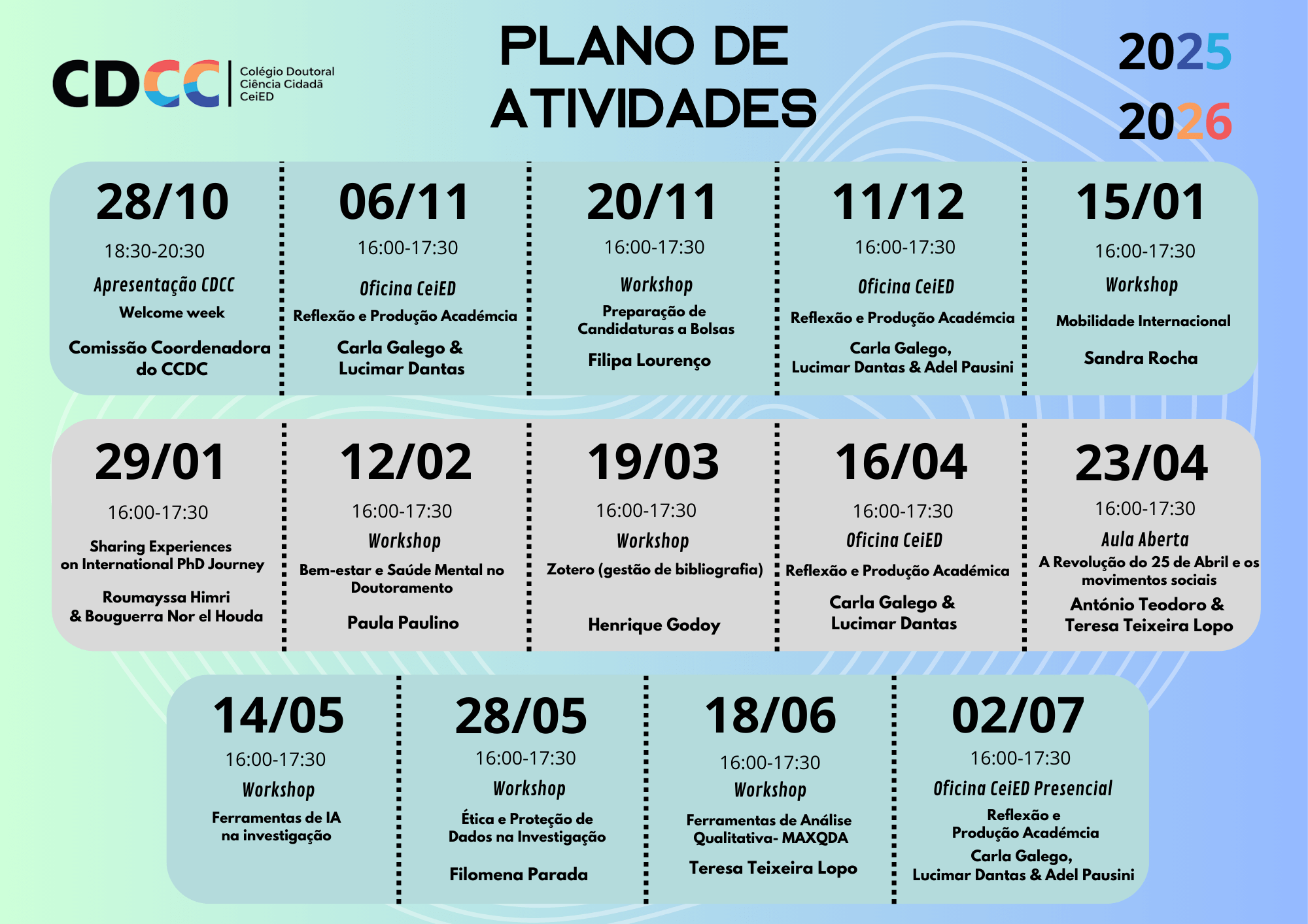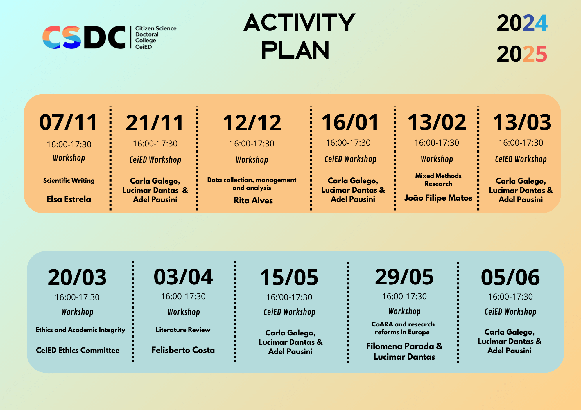 The activities will be divided into Workshops and CeiED Labs. The Workshops will feature various guest speakers and will address a range of themes.
